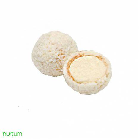 Kruche kuleczki waflowe z nadzieniem śmietankowym, posypne wiórkami kokosowymi.