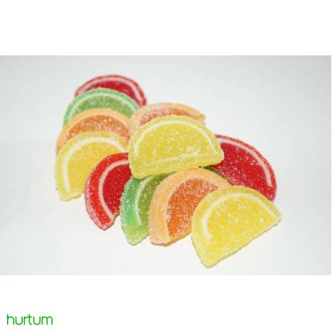 Galaretka owocowa w kształcie cytrynek, posypana cukrem.