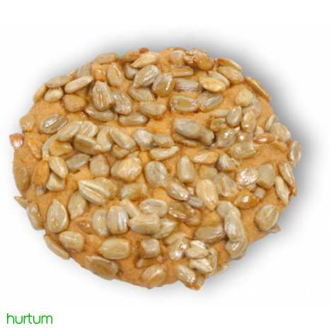 Kruche, okrągłe ciasteczko, posypane ziarnami słonecznika.