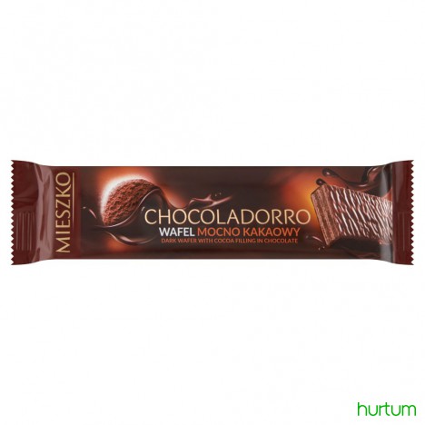 Wafelek z ciemnym listkiem przekładany kremem kakaowym (50%) w czekoladzie.