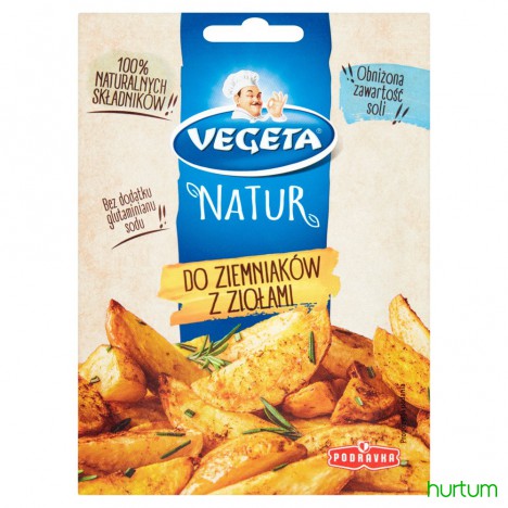 1. Ziemniaki pokroić na ćwiartki. Doprawić Vegetą Natur do ziemniaków. Dodać masło i wymieszać.