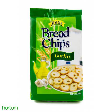 Przekąska Bread Chips greckiej firmy Tottis Bingo SA to pyszne, podwójnie wypiekane małe grzanki pszenne z dodatkami - w tym przypadku o smaku czosnku. Idealne jako przekąska na co dzień, dodatek do sałatek.