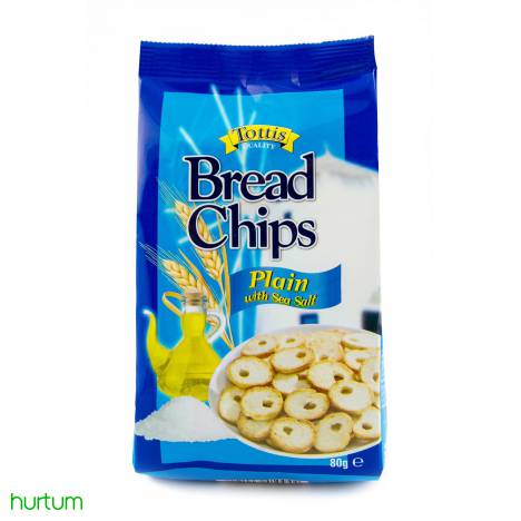 Przekąska Bread Chips greckiej firmy Tottis Bingo SA to pyszne, podwójnie wypiekane małe grzanki pszenne z dodatkami - w tym przypadku o smaku soli. Idealne jako przekąska na co dzień, dodatek do sałatek.