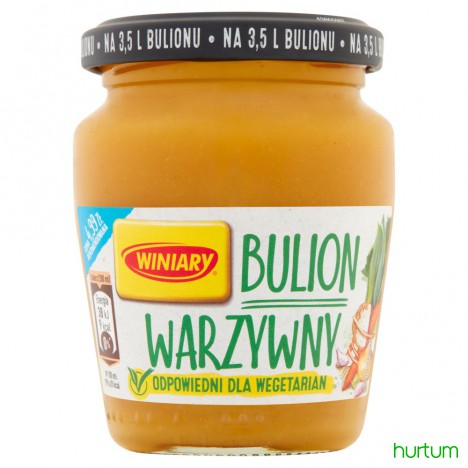 Pasteryzowany Bulion warzywny Winiary to esencjonalny bulion o unikalnej półpłynnej konsystencji, który doskonale podkreśli smak Twoich potraw. Wykorzystać go możesz jako bazę do zup lub jako sposób na pogłębienie smaku różnorodnych dań.
