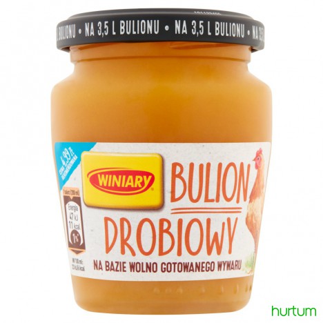 Pasteryzowany Bulion drobiowy Winiary to esencjonalny bulion o unikalnej półpłynnej konsystencji, który doskonale podkreśli smak Twoich potraw. Wykorzystać go możesz jako bazę do zup i sosów lub jako sposób na pogłębienie smaku różnorodnych dań.