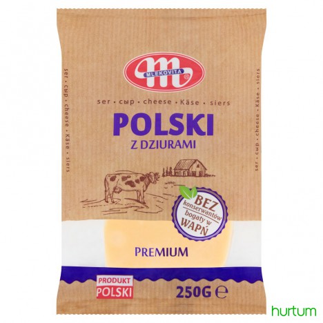W roku jubileuszu 100-lecia odzyskania niepodległości MLEKOVITA - jako firma ze 100% polskim kapitałem - chcąc podkreślić polskość zarówno firmy, jak i jej wyrobów, wprowadziła na rynek nowy produkt: POLSKI Z DZIURAMI. To unikalnej jakości ser dojrzewający, który powstaje z polskiego mleka. Charakteryzuje się łagodnym smakiem właściwym dla serów typu holenderskiego oraz oczkami typowymi dla serów typu szwajcarskiego. Jest bogatym źródłem wapnia, który m.in. przyczynia się prawidłowego metabolizmu energetycznego, i białka, które pomaga w utrzymaniu zdrowych kości i masy mięśniowej. Nie zawiera konserwantów. Odpowiedni dla osób na diecie bezglutenowej i wegetariańskiej. Doskonały na wykwintną deskę serów, jako samodzielna przekąska czy składnik przystawek i potraw. POLSKI Z DZIURAMI dostępny jest w popularnej porcji 250 g w opakowaniu w nawiązującej do polskich tradycji szacie graficznej.