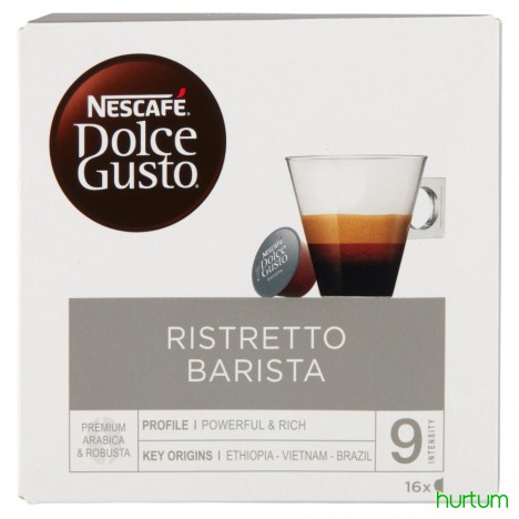 Nescafé Dolce Gusto Ristretto Barista to ciemna kawa palona z intensywnością 9 na 11. Mniejsza od Espresso, idealnie pasuje do filiżanki 35 ml. Pełna konsystencja z gęstą pianką ""cremą"". Nasi utalentowani bariści połączyli owocowe ziarna południowo-amerykańskiej i wschodnio-afrykańskiej Arabiki z azjatycką Robustą, aby stworzyć idealną Nescafé Dolce Gusto Ristretto Barista. Delektuj się równowagą pomiędzy nutą kakao i cytrusowym aromatem.