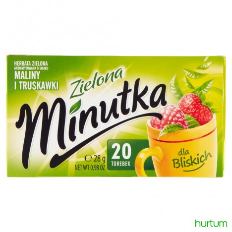 Herbata zielona aromatyzowana o smaku maliny i truskawki w torebkach do zaparzania.