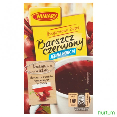 Barszcz czerwony instant od Winiary to barszcz, którego smak został stworzony na bazie ulubionego przez Polaków Barszczu czerwonego Winiary. To zupa o doskonałym smaku, aromacie i kolorze. Barszcz czerwony Winiary ma wszystkie zalety idealnego barszczu: smak słodkich buraków, doprawienie czosnkiem i majerankiem oraz głęboki, rubinowy kolor. Barszcz czerwony instant od Winiary to pyszny pomysł na przekąskę w zabieganym dniu! Wsyp zawartość saszetki do kubka, zalej gorącą wodą, dokładnie wymieszaj, poczekaj 3-4 minuty i gotowe! Spróbuj także innych zup instant od Winiary, o dobrze nam znanych tradycyjnych smakach: pomidorowa, rosół z kury, grochowa, pieczarkowa czy żurek