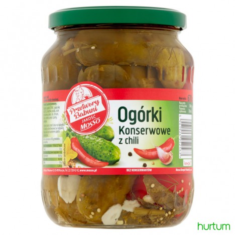 - Chrupiące ogórki konserwowe, o wyrazistym, lekko pikantnym smaku dzięki obecności papryczki chili.