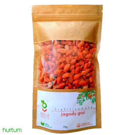 SKŁADNIKI: 100% polskie liofilizowane jagody Goji. "Pochodzące wyłącznie z polskich plantacji liofilizowane jagody goji to bogate źródło witaminy C i naturalnych antyoksydantów. Doskonałe na przekąskę, albo jako ciekawy i smaczny dodatek do żywności. Nowy produkt marki GojiChoice® niewątpliwie wyróżni Państwa ofertę pośród ludzi pragnących jeść lepiej i żyć lepiej, wzbogacając ją o najzdrowsze owoce świata - Jagody Goji – „Czerwone Diamenty Wschodu”. Niezwykłe jednak bo z polskich plantacji. Diamenty wyselekcjonowane tylko spośród tych ociekających przyjemnym ciepłem leniwie przemieszczającego się ku zachodowi letniego słońca. Jagód z polskiej wsi, ale tylko tych, które z każdym gotowe są podzielić się pełnią bogactwa swych wartości i w każdym momencie, niezależnie od następujących po sobie pór roku, pachnące równie wspaniale jak w chwili zrywania ich z krzewu. Zdrowe i naturalne, wyzwalające energię na pół nocy, skarby z Południa. Dzięki idei GojiChoice® zrodzonej w Krakowie, wysuszonej mrozem i zamkniętej w 50-gramowe wygodne doypack’i pozwalające zabrać ze sobą w dowolne miejsce te najzdrowsze owoce świata by cieszyć się ich niepowtarzalnym smakiem zawsze gdy przyjdzie na to ochota!" WARTOŚĆ ODŻYWCZA W 100 G: Wartość energetyczna 1420 kJ / 340 kcal, Tłuszcz - 5 g, w tym kwasy tłuszczowe nasycone - 1,4 g, Węglowodany - 58 g, w tym cukry - 30 g, Białko - 15 g, Sól - 0 g. ZALECANE WARUNKI PRZECHOWYWANIA: Przechowywać w suchym miejscu, w temperaturze pokojowej, w szczelnie zamkniętym opakowaniu.