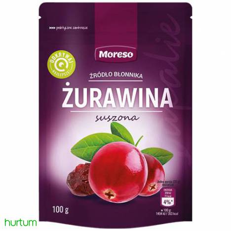 Skład: Żurawina suszona 51%, cukier trzcinowy, olej słonecznikowy