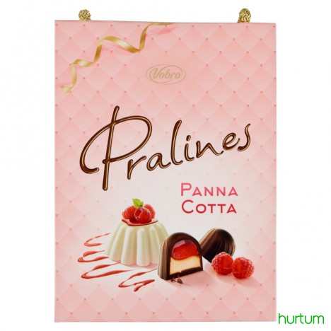Praliny z czekolady (50%) z nadzieniem o smaku Panna Cotta z malinami.
