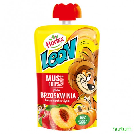 Mus owocowo-warzywny jabłko, brzoskwinia, banan, marchew, dynia. 100 % owoców i warzyw z dodatkiem witaminy C. Częściowo z zagęszczonego przecieru. Przecierowy. Pasteryzowany. Bez dodatku cukrów. Zawiera naturalnie występujące cukry. Bogaty w witaminę C i błonnik.