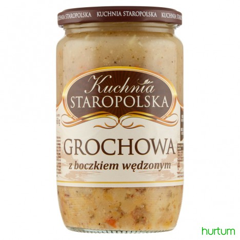 Zupa grochowa z boczkiem wieprzowym wędzonym. Produkt sterylizowany.