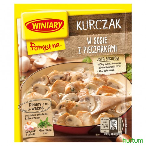 Winiary Pomysł Na… Kurczaka w sosie z pieczarkami to prosty sposób na przygotowanie doskonałej codziennej potrawy z kurczaka. Posiłek będzie gotowy zaledwie w 20 minut! Dzięki Pomysłowi na… Kurczaka w sosie z pieczarkami łatwo i szybko przygotujesz doskonale usmażoną pierś z kurczaka w kremowym sosie. Dzięki aromatycznej mieszance suszonych warzyw, ziół i przypraw pierś z kurczaka będzie smaczna i soczysta, a podana z świeżymi warzywami, natką pietruszki oraz ryżem lub makaronem może być częścią zbilansowanego i wartościowego posiłku.