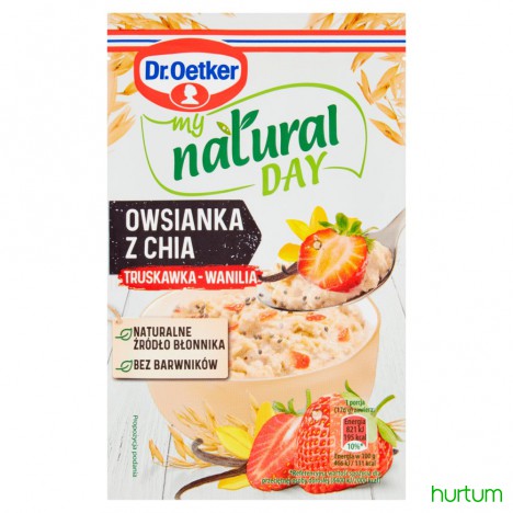 My Natural Day owsianka z chia to wygodna, pyszna i zdrowa propozycja na pierwsze lub drugie śniadanie oraz przekąskę w ciągu aktywnego dnia. Zawiera wiele wartościowych składników, takich jak nasiona chia oraz owoce, a dzięki zawartości płatków owsianych jest pożywną przekąską. Do przygotowania owsianki wystarczy jedynie wrzątek i miseczka lub kubek.