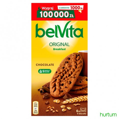 4 ciastka belVita + produkt mleczny + porcja owoców + ciepły napój.