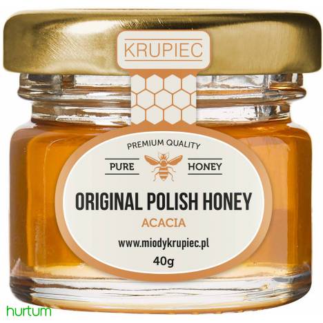 Miód akacjowy 40 g czyli mały słoiczek miodu.