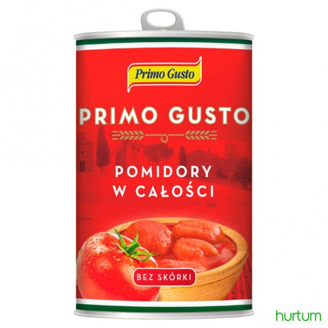 Pomidory w całości bez skórki w lekko zagęszczonym soku pomidorowym.