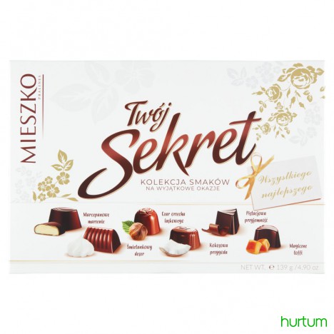 Praliny w czekoladzie mlecznej i deserowej w sześciu smakach: toffi, pistacjowym, orzechowym, kokosowym, śmietankowym, marcepanowym.