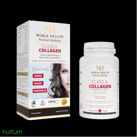 Class A Collagen to produkt przeznaczony dla osób, które chcą zadbać o swoją skórę, włosy i paznokcie. Suplement diety powstał na bazie składników aktywnych, głównie kolagenu klasy A pozyskiwanego z ryb morskich, kwasu hialuronowego oraz ekstraktu z pestek winogron. Skład i zawartość produktów Noble Health pozwala na ich łączenie oraz stosowanie przez osoby w różnym wieku. Produkt został poddany badaniom w odniesieniu do skóry i włosów przeprowadzonym przez Collegium Medicum w Bydgoszczy, które wykazały m.in. 80% uzupełnienia brakującego cynku we włosach podczas 3-miesięcznego okresu suplementacji.