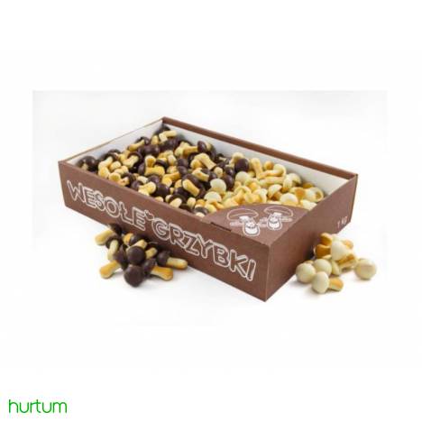 Kruche ciasteczka "Wesołe Grzybki" Stópka to kruche ciasteczko a łepek to mleczna czekolada ciemna oraz biała. Pyszne ciasteczka pakowane po 1kg. - około 180sztuk w miksie.