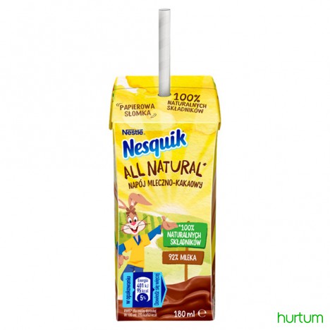 Nesquik All Natural to gotowy do picia napój mleczno-kakaowy w kartoniku, który stanowi doskonałe rozwiązanie na naturalną i pyszną szkolną przekąskę dla Twojego dziecka. Nesquik All Natural zawiera w składzie wyłącznie pięć w 100% naturalnych składników, z czego aż 92% stanowi mleko. Nowy Nesquik jest pysznym sposobem na wprowadzenie większej ilości mleka do diety Twojego dziecka.