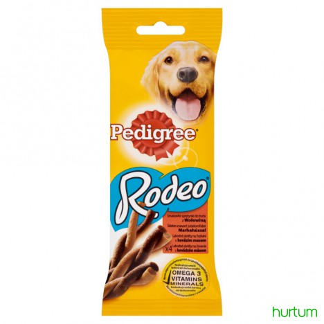 Jeśli chcesz podarować swojemu psu wyjątkową przekąskę, która wystarczy mu na długo, a zarazem wpłynie korzystnie na jego zęby i dziąsła, Pedigree Rodeo będzie najlepszym wyborem. To niezwykle smaczne mięsne specjały w unikalnym kształcie sprężynek, stworzone z wysokiej jakości wołowego mięsa. Ich unikalna, elastyczna konsystencja sprawia, że pies będzie gryzł i żuł je o wiele dłużej niż inne smakołyki, ciesząc się smakiem i dostarczając swojemu organizmowi codzienną porcję białka i witamin, niezbędną do jego prawidłowego funkcjonowania. Pedigree Rodeo z wołowego mięsa to najlepsza nagroda dla Twojego psa.