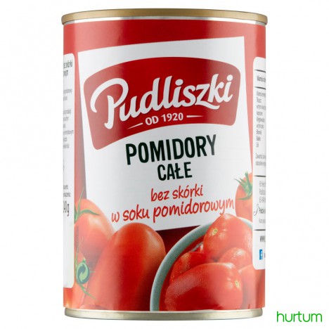 Pomidory całe bez skórki w soku pomidorowym. Produkt pasteryzowany.
