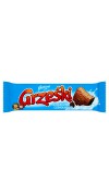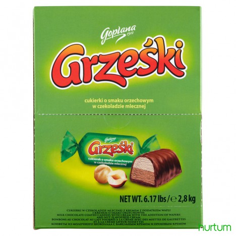 Cukierki w czekoladzie mlecznej (22%) z kremem z dodatkiem wafli (8,5%) i kremem o smaku orzechowym (37%).