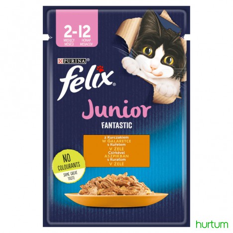 Zalecenia żywieniowe: Felix Fantastic Junior to karma pełnoporcjowa, co oznacza, że może byc jedynym źródłem pokarmu podawanym w ciągu dnia. Po prostu nałóż karmę na miseczkę i podaj swojemu kotkowi. Podawaj zgodnie z zaleceniami dotyczącymi dawkowania bez względu na smaki, jakie wybrałeś. Każde kocię ma inne potrzeby, które są zależne od jego poziomu aktywności oraz budowy, dlatego ilość podawanego pokarmu oraz pory posiłków wymagają indywidualnego dostosowania. Podawaj w temperaturze pokojowej - zawsze zapewniaj kocięciu dostęp do świeżej, czystej wody do picia. Podawaj swojemu kotkowi jedzenie zawsze w tym samym miejscu tak, żeby wyrabiać w nim dobre nawyki i nie rozpraszac go w trakcie jedzenia. Felix Junior jest odpowiedni również dla kotów wysterylizowanych. Ilość podawanej karmy powinna zostać dostosowana tak, aby utrzymać prawidłową, szczupłą sylwetkę Twojego kota. Felix Junior jest odpowiedni również dla kotek ciężarnych i karmiących, ponieważ potrzebują one karmy bogatej energetycznie, aby mogły zatroszczyć się o swoje przyszłe potomstwo. Po 12 miesiącach Twoje kocię stanie się dorosłym kotem gotowym do wypróbowania pysznej gamy produktów Felix Fantastic Adult dla dorosłych kotów.