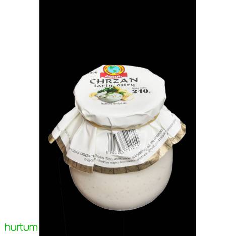 Składniki: korzeń tarty chrzanu (70%),woda, cukier, ocet jabłkowy, olej rzepakowy, sól, kwas cytrynowy, Witamina C, substancja konserwująca (pirosiarczan sodu, zawiera siarczany).