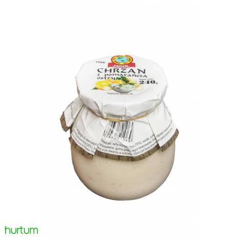 Składniki: tarty korzeń chrzanu (60%), skórka pomarańczy (28%) woda, cukier, ocet jabłkowy, olej rzepakowy, sól, regulator kwasowości (kwasek cytrynowy)