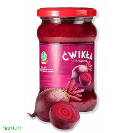 Składniki : burak ćwikłowy, chrzan tarty (20%), woda, ocet jabłkowy, cukier, sól, przyprawy