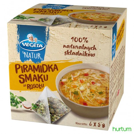 Starannie dobrana mieszanka pięciu aromatycznych przypraw, ziół i warzyw zamknięta w praktycznej i łatwej do użycia Piramidce Vegeta Natur wzbogaci smak Twojej zupy. Odpowiednie proporcje każdego ze składników pozwolą na uzyskanie esencjonalnego smaku z charakterystycznym aromatem cebuli i lubczyku. Zaletą Piramidki jest to, że szybko i łatwo możesz ją usunąć z zupy i delektować się jej smakiem bez konieczności wyławiania pojedynczych przypraw z talerza.