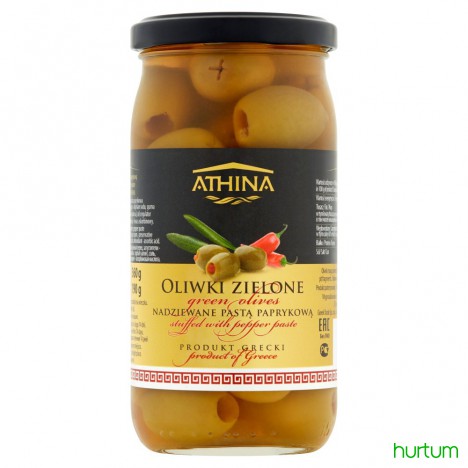 Oliwki zielone nadziewane pastą paprykową. Produkt pasteryzowany.
