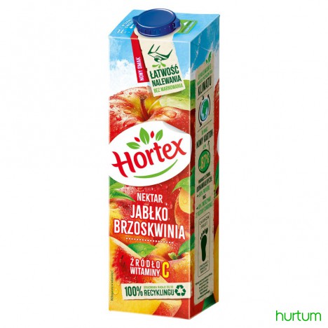Hortex Jabłko Brzoskwinia - nektar o wyśmienitym smaku świeżych owoców: aksamitnych brzoskwiń i polskich jabłek. Wyprodukowany z wyselekcjonowanych, najlepszych owoców, które są doskonałym źródłem witaminy C. Produkt dostępny w nowym kartonie, którego kształt ułatwia nalewanie produktu - bez marnowania. Opakowanie jest bardziej przyjazne dla klimatu, ponieważ w 100 % nadaje się do recyklingu i w aż 87 % pochodzi ze źródeł odnawialnych. Zakrętka wyprodukowana z tworzywa z trzciny cukrowej