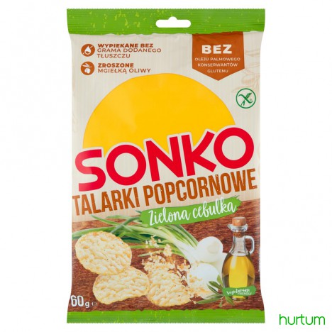 Wypiekane bez dodatku tłuszczu Sonko talarki popcornowe zroszone są delikatną mgiełką oliwy oraz obsypane aromatyczną posypką. Stanowią doskonałą alternatywę dla smażonych przekąsek ze względu na swój niepowtarzalny smak. Ich wyjątkowy charakter podkreślony jest poprzez odpowiedni dobór kompozycji przypraw i dodatków smakowych, bez zastosowania konserwantów i glutaminianu monosodowego. Idealnie sprawdzą się jako sycąca i chrupiąca przekąska w ciągu dnia.