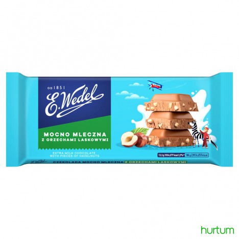Czekolada mocno mleczna z kawałkami orzechów laskowych.