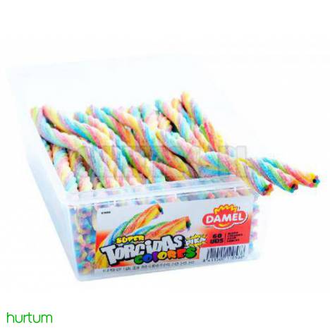 Skręcone żelowe kabelki o smaku wieloowocowym z kwaskowo cukrową posypką. Długość kabelka 25cm Opakowanie 60 szt. Waga 1 szt. 27g