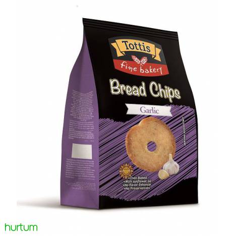 Przekąska Bread Chips greckiej firmy Tottis Bingo SA to pyszne, podwójnie wypiekane małe grzanki pszenne z dodatkami - w tym przypadku o smaku czosnku. Idealne jako przekąska na co dzień, dodatek do sałatek. Nowość - na oleju słonecznikowym.