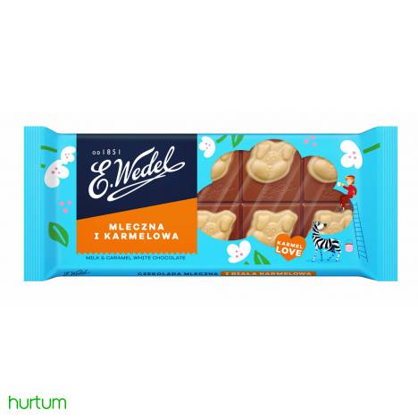 Czekolada mleczna 82,5% (Cukier, Mleko pełne w proszku, Tłuszcz kakaowy, Miazga kakaowa, Serwatka w proszku (z mleka), Tłuszcz mleczny, Emulgatory: lecytyny sojowe i E 476, Aromat), Czekolada biała karmelowa 17,5% (Cukier, Tłuszcz kakaowy, Mleko pełne w proszku, Proszek karmelowy 10% (Mleko odtłuszczone, Serwatka (z mleka), Cukier, Masło, Aromat), Serwatka w proszku (z mleka), Emulgatory: lecytyny sojowe i E 476, Sól). Czekolada mleczna: masa kakaowa minimum 26%, masa mleczna minimum 19%. Może zawierać orzeszki arachidowe, orzechy, zboża (gluten), jaja