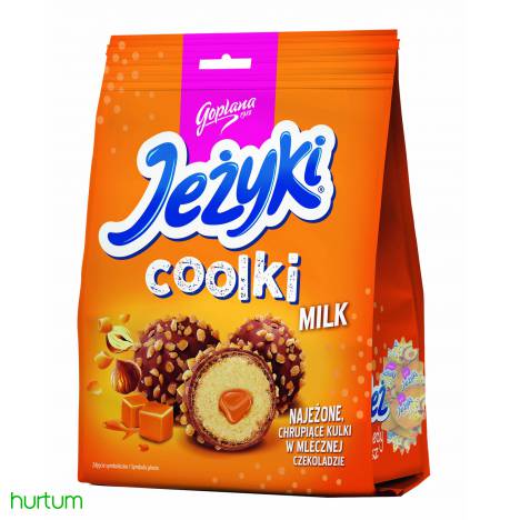 Kultowe i uwielbiane Jeżyki w formie delikatnych, waflowych kulek, wypełnionych pysznym, karmelowym kremem, oblane czekoladą mleczną i obsypane orzechami z kroplą karmelu w środku.
