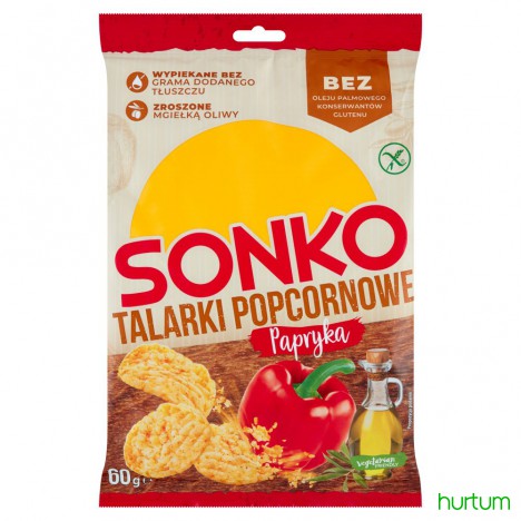 Wypiekane bez dodatku tłuszczu Sonko talarki popcornowe zroszone są delikatną mgiełką oliwy oraz obsypane aromatyczną posypką. Stanowią doskonałą alternatywę dla smażonych przekąsek ze względu na swój niepowtarzalny smak. Ich wyjątkowy charakter podkreślony jest poprzez odpowiedni dobór kompozycji przypraw i dodatków smakowych, bez zastosowania konserwantów i glutaminianu monosodowego. Idealnie sprawdzą się jako sycąca i chrupiąca przekąska w ciągu dnia.