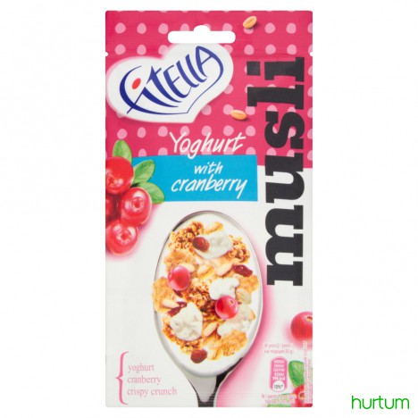 | musli crunchy 11% [płatki owsiane, syrop glukozowo-fruktozowy, kulki pszenne (mąka pszenna, mąka kukurydziana, otręby pszenne, cukier, sól), olej palmowy, wiórki kokosowe, cukier, sól, aromat, emulgator: lecytyny (z soi)] |