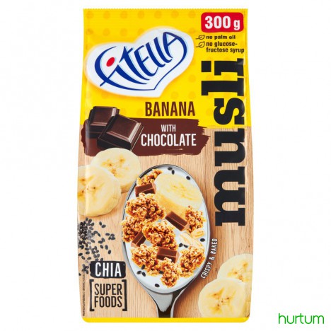 | 62,1% musli crunchy [płatki owsiane pełnoziarniste, cukier, kulki pszenne (mąka pszenna, mąka kukurydziana, otręby pszenne, cukier, sól), olej rzepakowy, wiórki kokosowe, mąka żytnia, 1,7% nasiona chia (nasiona szałwii hiszpańskiej Salvia hispanica), sól, aromat, emulgator: lecytyny (z soi)] |