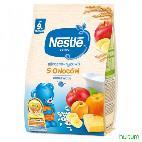 Kaszka mleczno-ryżowa 5 owoców to bezglutenowy produkt stworzony dla niemowląt po 9. miesiącu życia. Nie zawiera oleju palmowego. Jedna porcja kaszki dostarcza ponad 50% dziennego zapotrzebowania dziecka na żelazo, a obecność witaminy C wspiera jego wchłanianie. Kaszka Nestlè zawiera 11 witamin. W swoim składzie ma immunoskładniki, takie jak: cynk, żelazo, witaminy A* i C, które wspierają prawidłowe funkcjonowanie układu odpornościowego. Obecność kwasu alfa-linolenowego (ALA) z rodziny omega-3 wspiera rozwój mózgu.