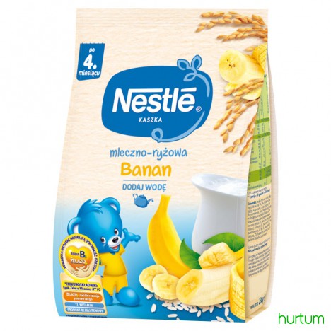 Kaszka mleczno-ryżowa Banan to bezglutenowy produkt stworzony dla niemowląt po 4. miesiącu życia. Nie zawiera oleju palmowego. Jedna porcja kaszki dostarcza ponad 50% dziennego zapotrzebowania dziecka na żelazo, a obecność witaminy C wspiera jego wchłanianie. Kaszka Nestlè zawiera 11 witamin. W swoim składzie ma immunoskładniki, takie jak: cynk, żelazo, witaminy A* i C, które wspierają prawidłowe funkcjonowanie układu odpornościowego. Obecność kwasu alfa-linolenowego (ALA) z rodziny omega-3 wspiera rozwój mózgu. Do jej przygotowania wystarczy dodać wodę.