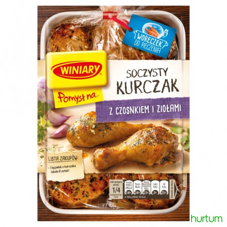 Winiary Pomysł Na… Soczystego kurczaka z czosnkiem i ziołami to propozycja na niebanalny i smaczny obiad. Dzięki załączonemu woreczkowi mięso jest niezwykle kruche i aromatyczne.